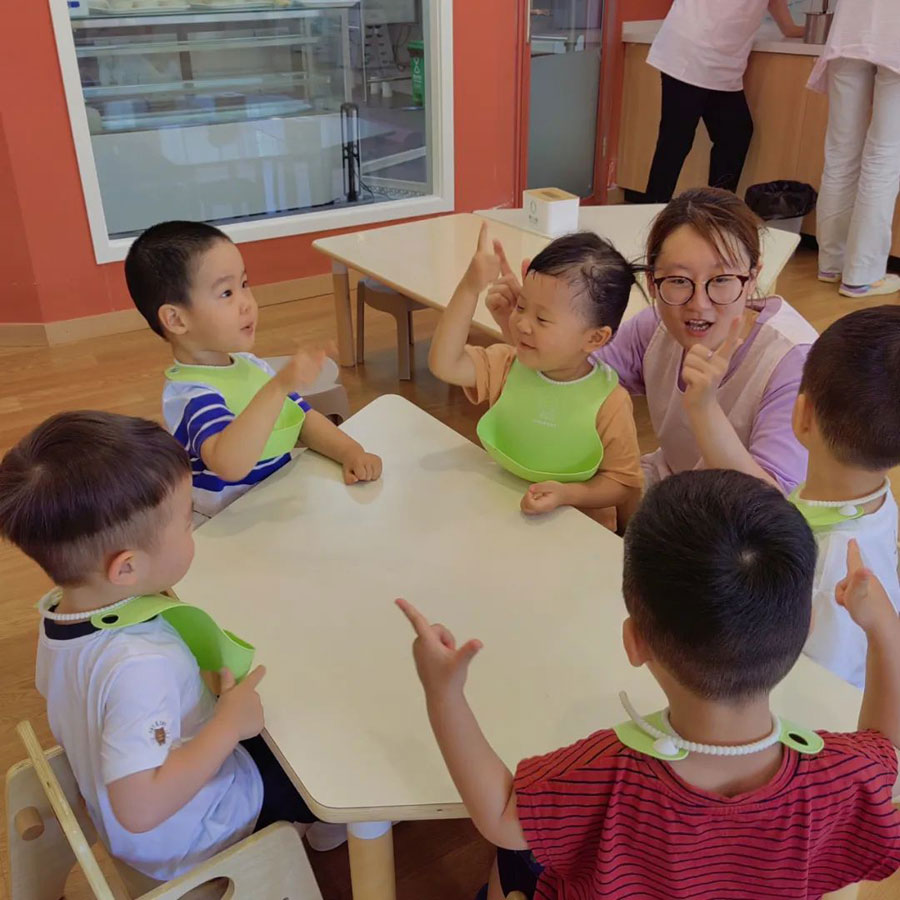 在托育园里,你会发现中午就餐时间保育师和孩子是在一起坐着吃饭的,我们一起讨论美食,享受美食,同时和孩子进入同样的状态感受中,而不是转来转去监督孩子的就餐过程,让孩子把吃饭当做任务一样,产生紧张抗拒的情绪。这样做不仅能更及时的观察到孩子的状态,遇到其他紧急情况也能更好的处理,也不会打消孩子对于享受美食的积极性。